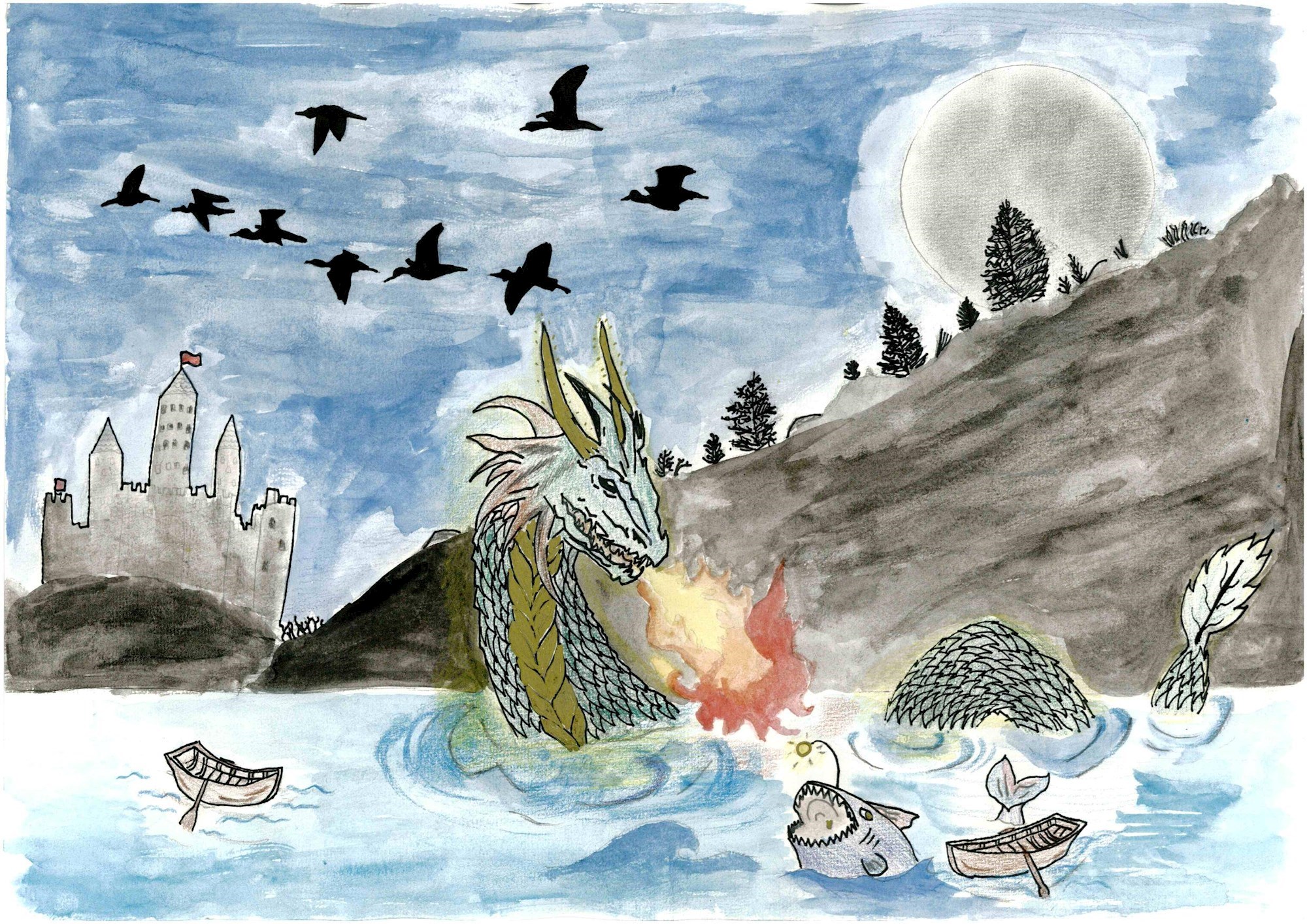 Um teilzunehmen, müssen Sie lediglich eine Nixe (oder andere Rheinkreaturen) und die Silhouette einer Burg zeichnen. Wenn Sie sich dafür entscheiden, die Silhouette einer Partnerburg am Oberrhein zu übernehmen, können Sie einen Bonus erhalten!